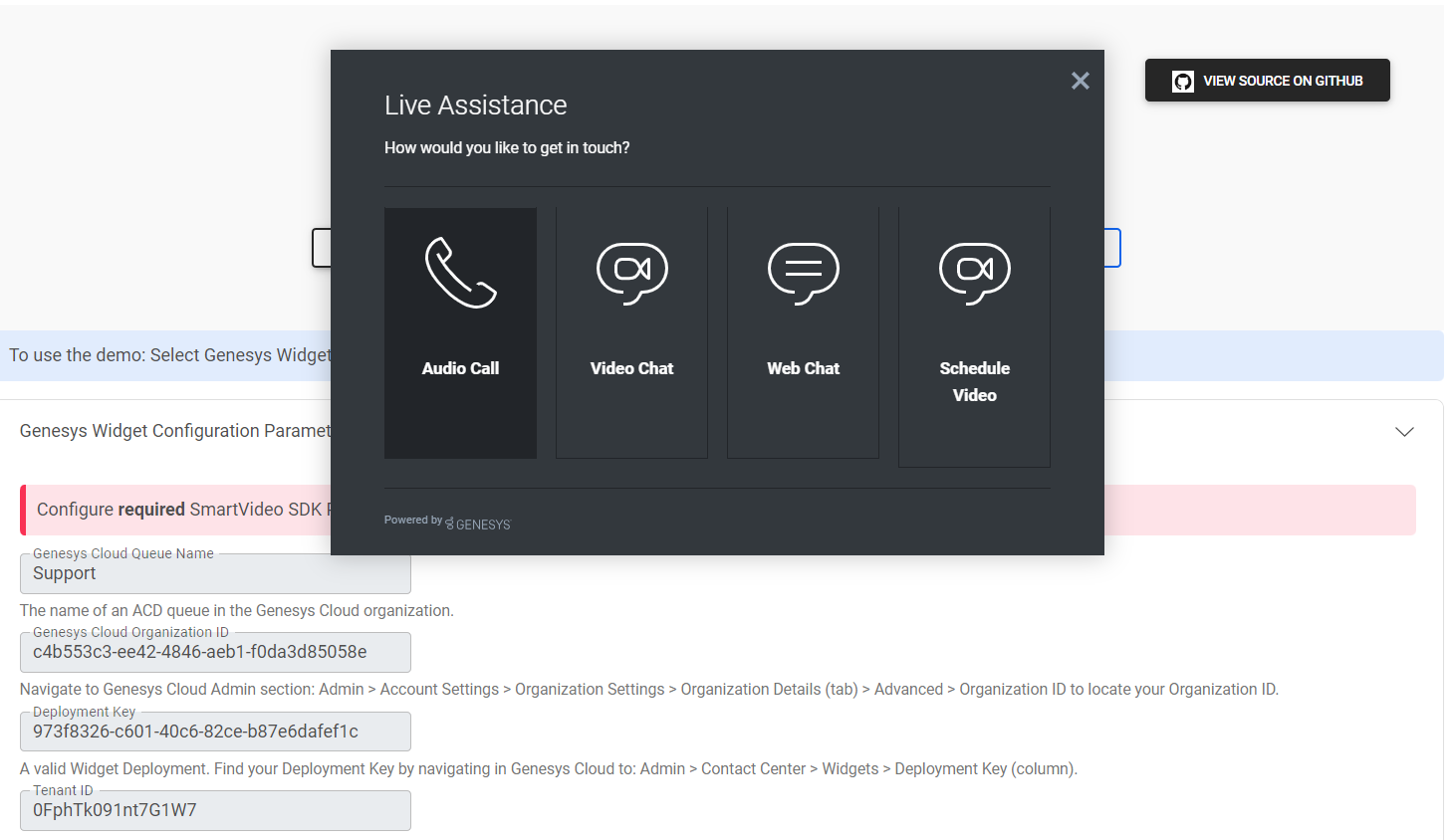 Allow demonstration of a direct "click to audio" capability directly in the widget integrations demo page . Demonstrates how you can engage your customers through an audio only channel in addition to the existing options of click to video, schedule meeting, and webchat.
