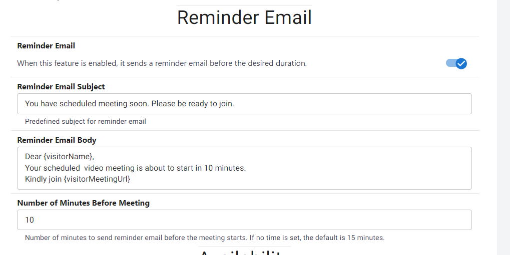 A reminder email BODY - can use the same template variables as other emails. For example 'Dear {visitorName}, your meeting will start in 15 minutes'. Default text to be sent is ''This is a reminder for your upcoming video meeting.'